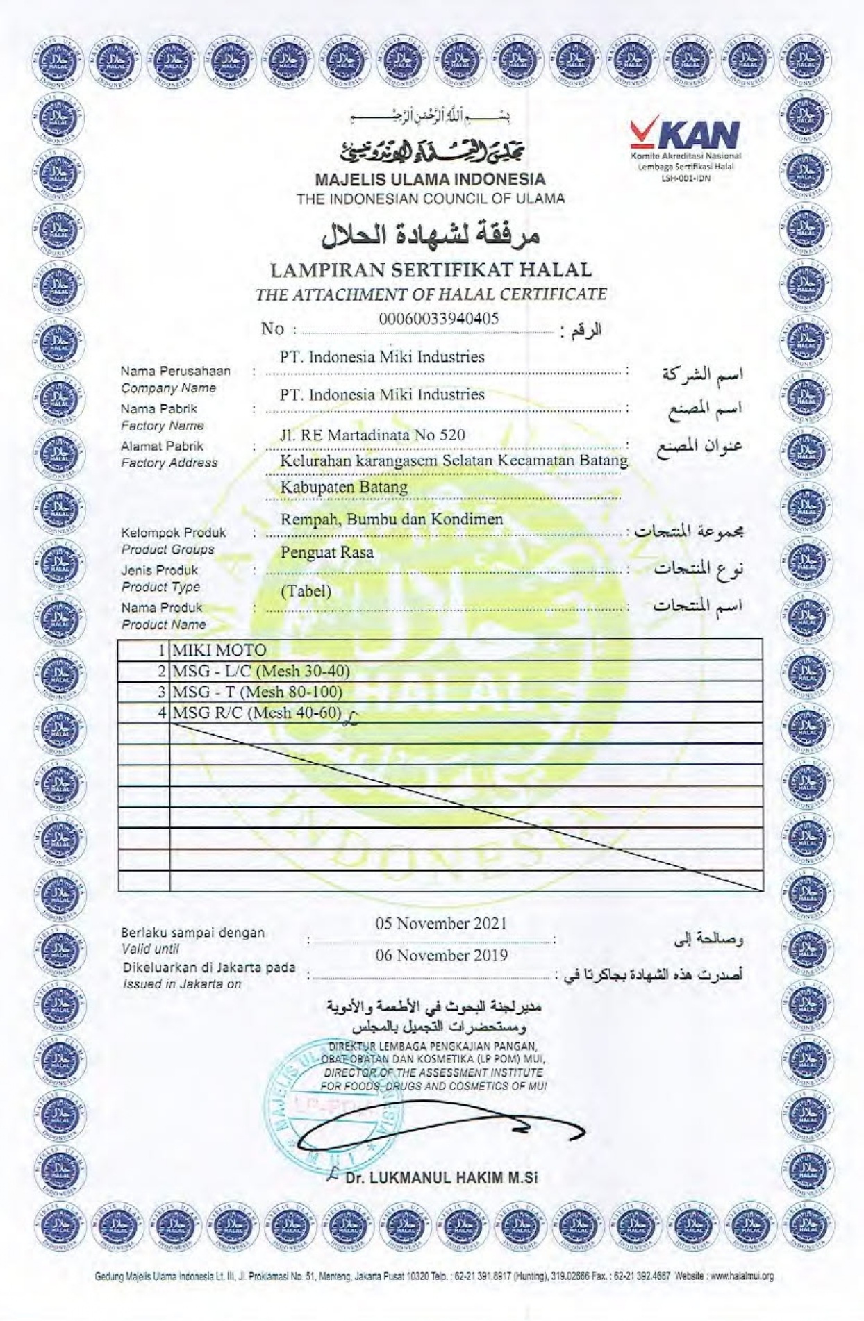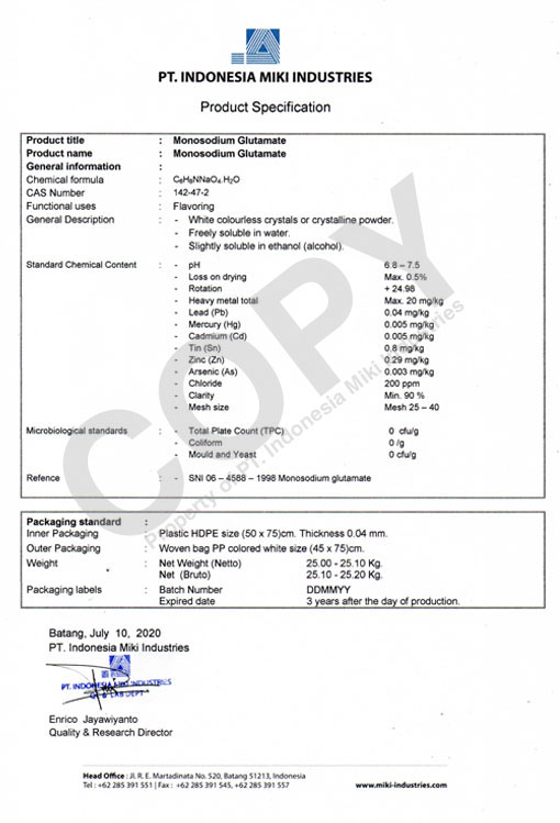 PT INDONESIA MIKI INDUSTRIES has all certifications for Monosodium Glutamate. All are required for domestic and international markets. Product Specification, MUI Halal are some of the certifications.